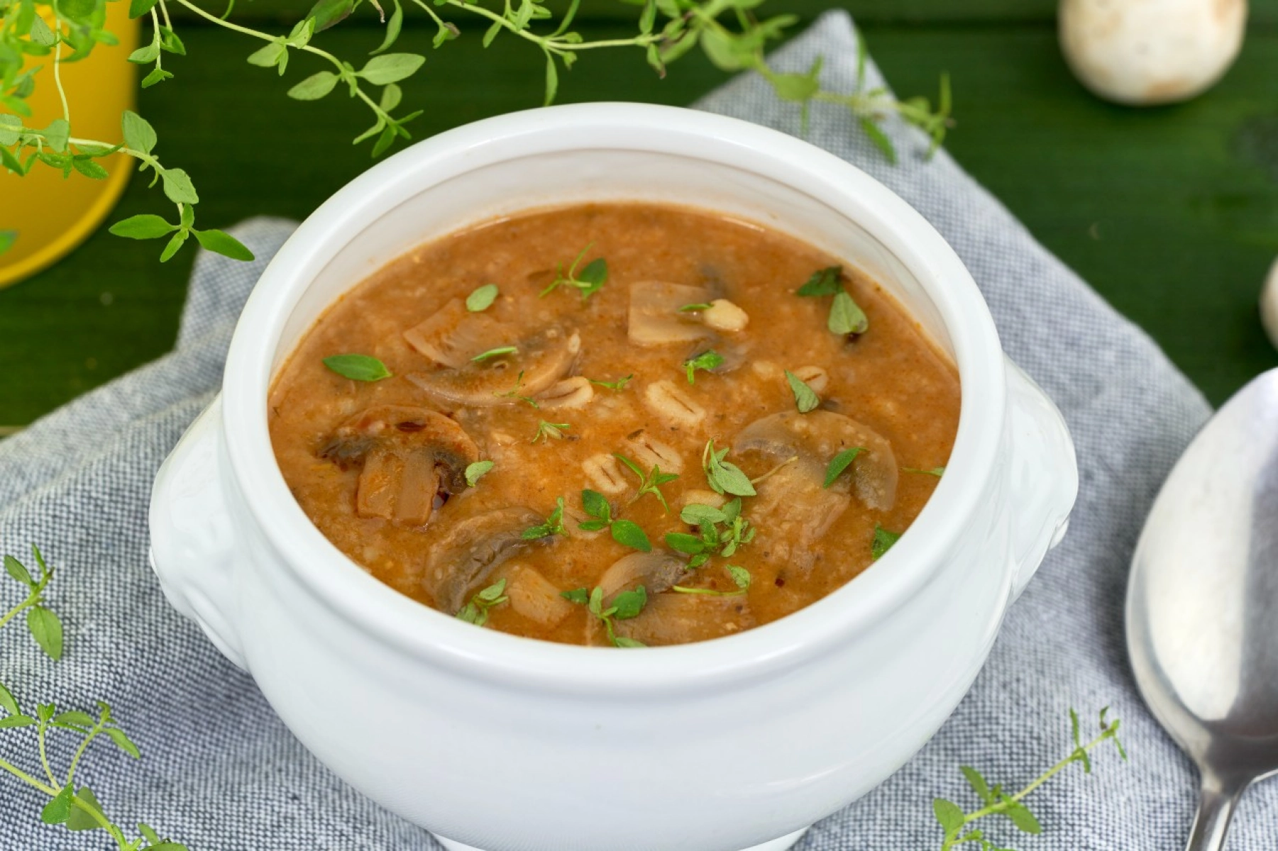 V hrnci rozehřejeme olej a orestujeme nadrobno nakrájenou cibuli a na plátky nasekaný česnek. Přidáme houby, tymián, sůl a pepř a restujeme. Přidáme odloženou tekutinu, zeleninový vývar, ječné kroupy, rajčatový protlak, popřípadě ještě vodu a vaříme cca 45 minut, dokud kroupy nezměknou.
